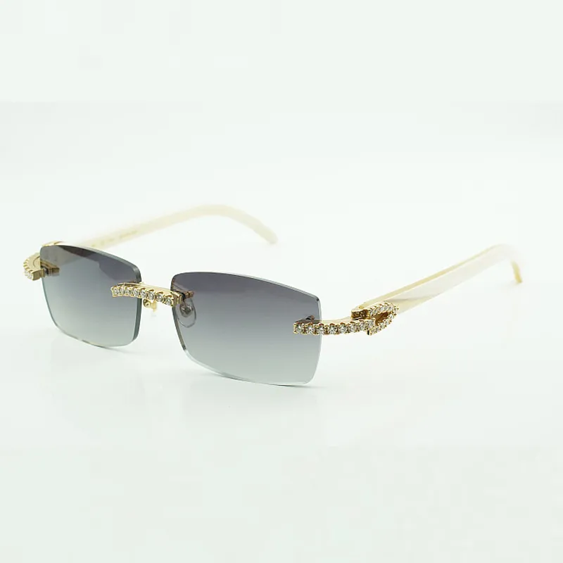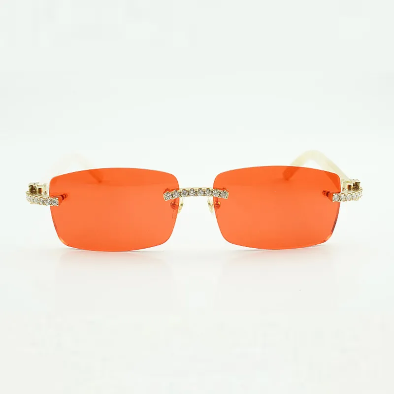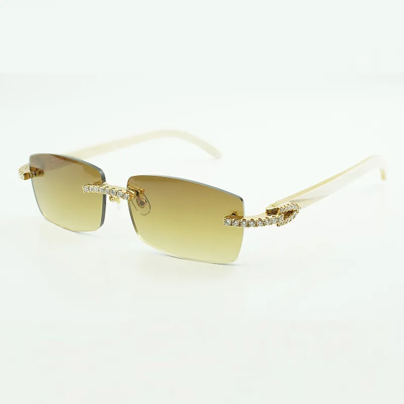 Luxury frameless diamond sunglasses crafted with natural white buffalo horn arms and 56mm premium lenses. A bold unisex design that blends high-end style with everyday comfort.